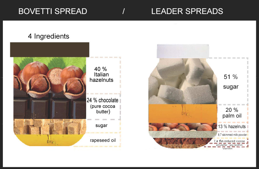 Premium spreads made with unique recipes : Italian hazelnuts, almonds or walnuts and pure cocoa butter chocolate as main ingredients.