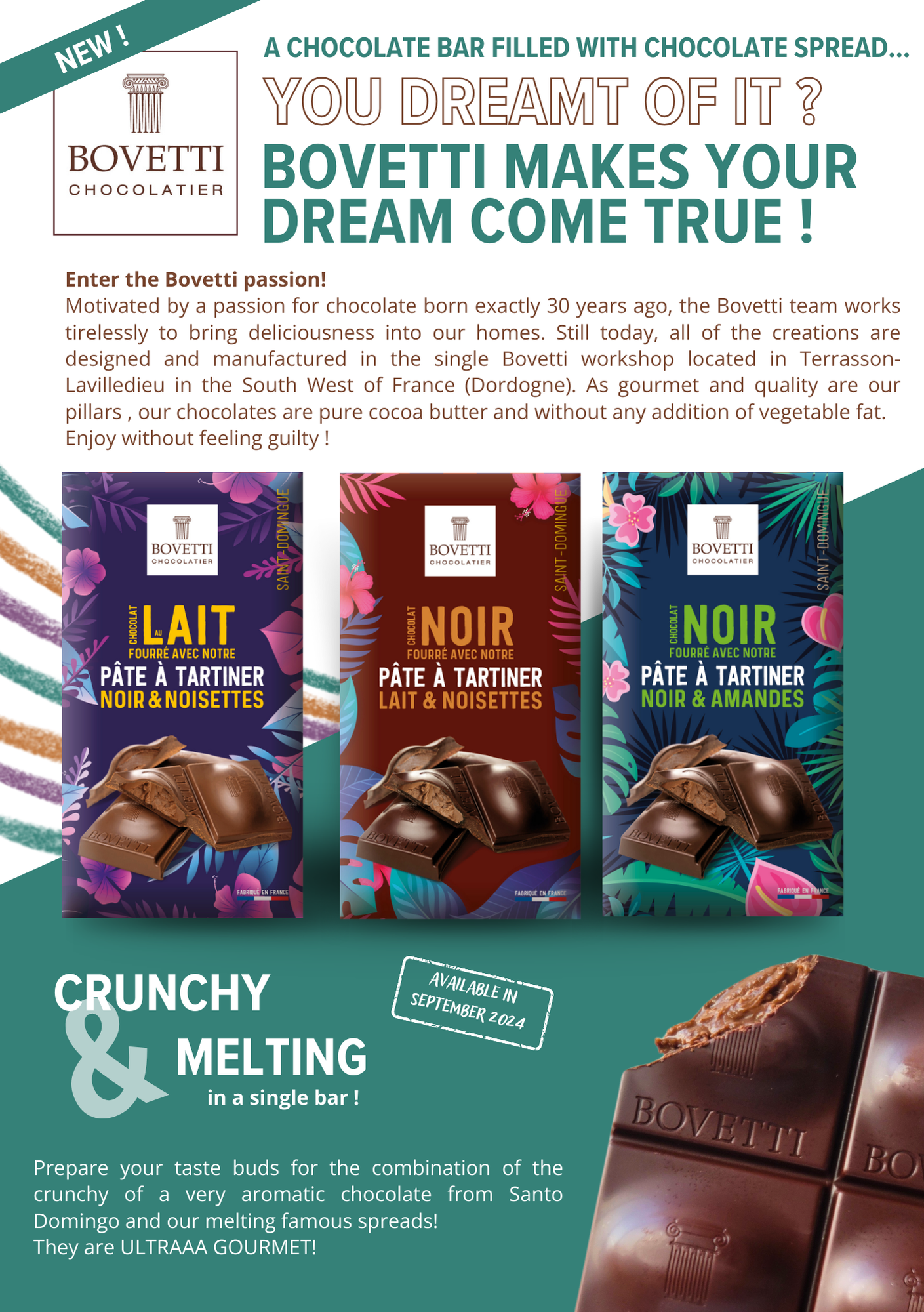 FILLED BARS : in 2025 a new ultra-gourmet line of chocolate bars filled with our signature chocolate spreads is launched. These filled chocolate bars exemplify Bovetti's commitment to quality and innovation, offering a delightful fusion of textures and flavors.
